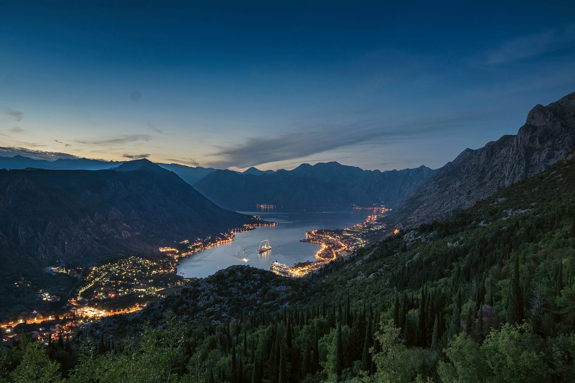 Small city, with mountins on one side and the beautiful bay of Kotor in front of it, with those cruisers around, and just one narrow road filled with traffic.